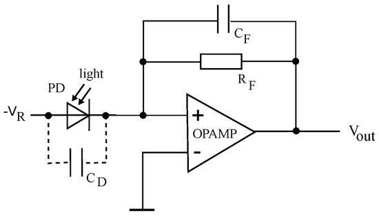 Drawing shows a basic TIA with photodetector. and are the feedback resistor and capacitor to the operational amplifier. is the capacitance of the photodetector, the reverse voltage to reduce this capacitance and is the output voltage.