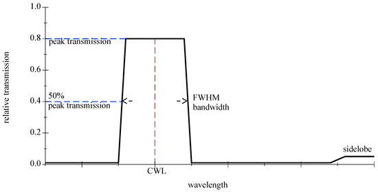 Optical bandpass filters are generally identified by their center wavelength (CWL) and their bandwidth in the passing range at 50% of the peak transmission, denoted as FWHM, see Figure 8. For further information please refer to [39]. Depending on the type, real bandpasses can show ripples in the distribution, smooth rounded slopes, or sidelobes.