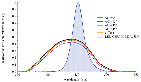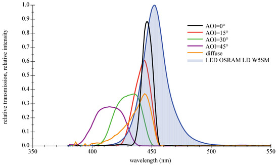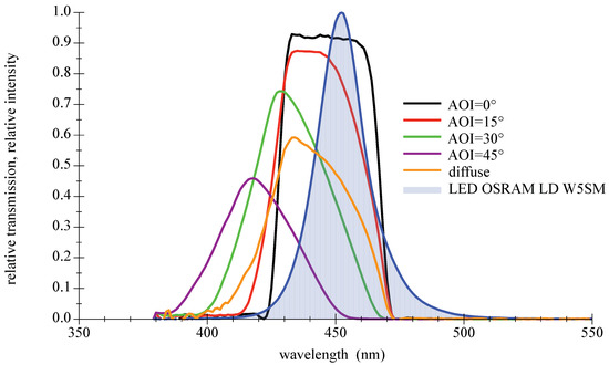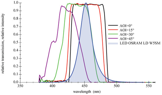 Their main advantages are high transmission values and steep slopes [42]. The disadvantage as bandpass filter is the AOI-dependent spectral shift of the transmission zone, which leads to a disintegration of the good characteristics at larger AOIs. Furthermore, thin film filters show an increasing sensitivity with rising AOIs to the polarization direction of light. This only applies to light sources such as lasers or LDs, not LEDs. A selection of filters with different properties suitable for deep blue LEDs are available off the shelf. Three types will be presented and examined in the remainder of this paper: narrow 10 nm bandpass and a wider low cost 40 nm type, both selected to encounter the center wavelength of the LED spectrum; see Figure 10 and Figure 11. The third filter is a high-quality 50 nm bandpass a few nanometers out of alignment towards higher wavelength to compensate for the AOI-related spectral shift in Figure 12. For further information on filter data please refer to [43,44,45].