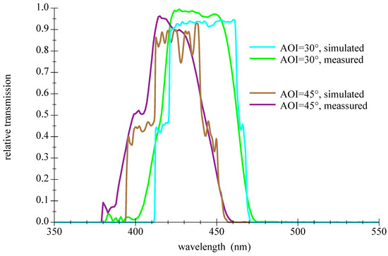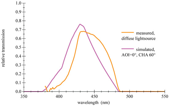 Another drawback of thin film filters is a certain sensitivity to the structure of the incident light; the steep slopes and the transmission are degrading in diffuse light as shown in Figure 13. A comparison of measured and simulated values for demanding conditions of large AOI is given in Figure 14.
