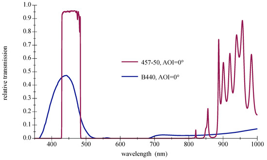 - Datasheet Hoya B440 Blue Filter; Hoya Candeo Optronics Corporation: Saitama, Japan, 2014; pp. 1–2. Available online: https://www.galvoptics.co.uk/optical-components/optical-filters/hoya-bandpass-filters/ (accessed on 14 September 2018).