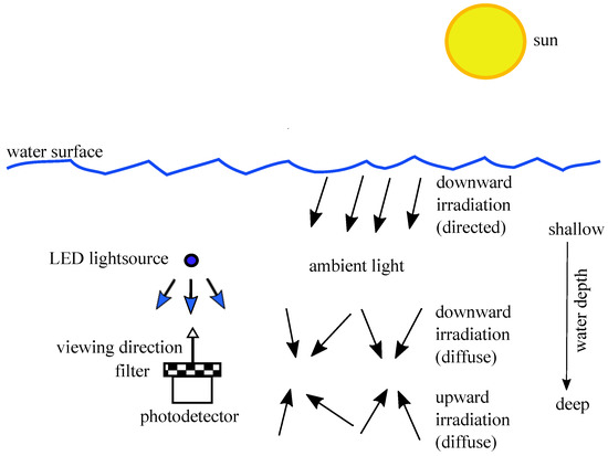The filter implemented in front of a PD should pass the signal from the LED light source and block the ambient light as well as possible. It is unavoidable, that the filter also passes the part of the ambient light spectrum which is within the bandpass; as an unwanted component, this represents optical noise. In Figure 16 the situation underwater is presented for the case of a straight upward-looking sensor.
