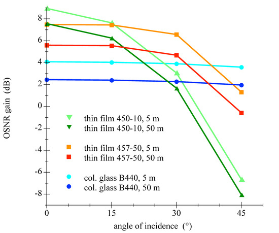 The analysis of the Table 3 and Table 4 and Figure 17 and Figure 18 shows that the Semrock 457-50 thin film bandpass filter would be the best choice of tested components. The attenuation of the LEDs signal is low with simultaneous tolerance of larger AOIs. This result would allow energy efficient applications with 60 FOV with comparatively high improvement of the OSNR compared to a colored glass filter.