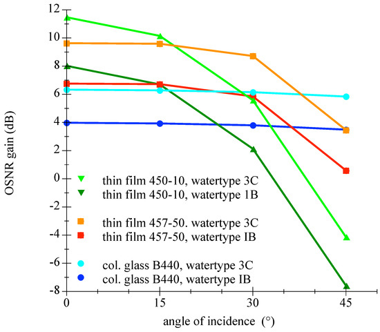 Please find further information regarding the calculations in the appendix in Appendix A.4. The upper term of the main fraction in Equation (12) represents the relative passed irradiation of the LED through the filter. Values for four examined different filters with varying AOI are given in Table 3. The lower term means the relative ambient light attenuation by the filter. Since the ambient light spectral composition is a function of the depth and the water type, this is considered in the scope of Table 4. By taking values from Table 3 and Table 4 and using Equation (13), the improvement in OSNR can be calculated for a specific filter, at a certain depth of a given water type for a desired angle of incidence. This has been performed for many cases and the results for varying water depth and is presented in Figure 17 and the outcome for diverse water types is illustrated in Figure 18.