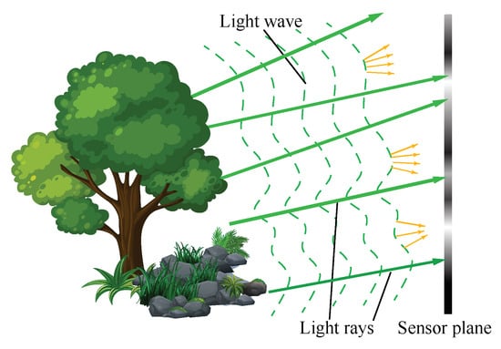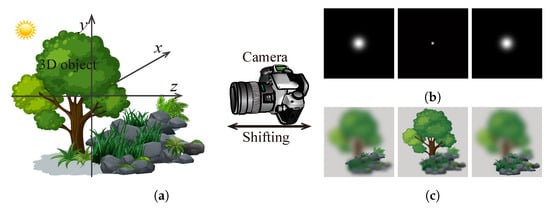In the focal plane sweeping capturing system, usually, only a camera with no other optical components is used, as Figure 7 shows. The captured image is the convolution between the image of the object and the point spread function (PSF) of the system at the corresponding plane [52]. , a captured image at a plane of , thus can be expressed as
