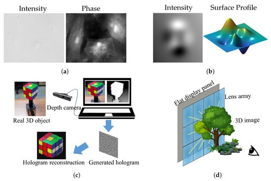 The applications of 3D imaging are extremely wide. Figure 3 shows several of them with different 3D imaging techniques. Figure 3a shows an object’s structure with phase imaging, Figure 3b shows a surface profile of a wavefront, Figure 3c is an example of 3D imaging with holography, and Figure 3d is an example of 3D display based on light field 3D imaging. The wavefront-based 3D imaging is efficient for viewing structures in microscopy [11] and medical applications. The light ray field, which can produce multiple view images with parallax, is a practical and commercialized way for both stereoscopic and auto-stereoscopic 3D displays [12,13]. Benefiting from 3D imaging, hologram synthesis, which sometimes combines the wavefront-based and ray-based light field techniques, can make a hologram of the real world 3D scene under incoherent illumination, making holographic 3D display more realizable [14,15].