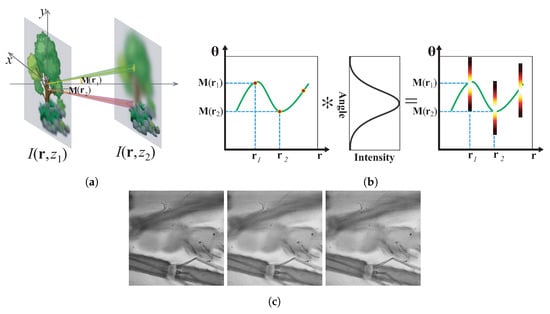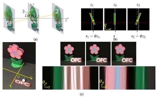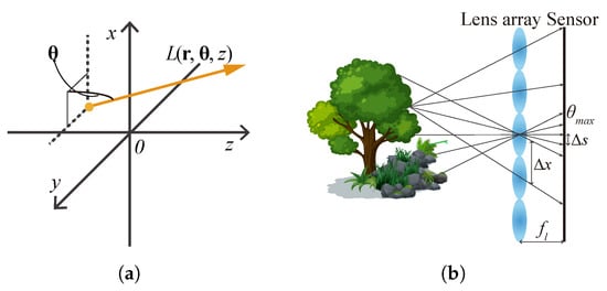 As Figure 4a shows, according to the plenoptic function [27], light ray field can be parameterized as a function with its spatial position and propagation direction , where is the position vector representing the transverse spatial coordinates and is the propagation vector of . Because of the conventional capture approach, light ray field is usually expressed by two planes as a four-dimensional (4D) function [28]. In this paper, we use the former one for convenience. Assuming that the energy traveling along the optical rays is a constant, the 2D images detected by a camera at a plane perpendicular to the optical axis at can be expressed by angularly integrating the the light rays