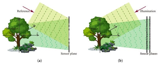 Wavefront-based light field imaging can mainly be categorized into two types: the interferometric approach and phase retrieval. The early wavefront light field imaging is based on the interferometry of waves, generally known as holography, which was first invented for microscopic imaging by Dennis Gabor [21] in 1948. As Figure 5a shows, the interference between the object wave and a known reference wave converts the object wave phase into intensity modulation, which makes it possible to reconstruct the phase both optically [45,46] and digitally [22,47].