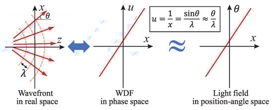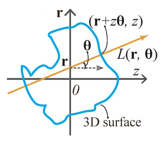We start from considering a 3D object with its center located at the origin of the Cartesian coordinates. Suppose the 3D object is regarded as a stack of 2D slices, i.e., . The light ray field representation of the 3D object with the principal plane located at its center can be expressed as the integral of the object’s projections by Figure 6 with [51]