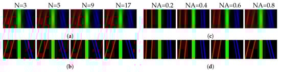 Since a 3D object can be discretized along the optical axis by , where N is the slice number, Equation (3) can be rewritten as . Therefore, when Q in Equation (6) approaches N, the first term approaches Equation (3), which corresponds to the discrete approximation of the 3D objects’ light field. When Q is much smaller than N, it is equivalent to axially sampling the object insufficiently, which affects the depth resolution of the reconstructed light field. The second term of Equation (6) is noise. Obviously, it is the accumulation of the defocus noise induced by the images of the object slices which are out of focus. From this equation, we can see that there are two main parameters affecting the noise: the number of depth images and the PSF of the camera. The PSF is related to the f-number of the camera, i.e., the NA. As the second term of Equation (6) shows, for the LFBP technique, smaller NA and fewer images produce a higher quality reconstructed light ray field. However, to maintain the depth resolution of the reconstructed light field, the number of the captured images should be large enough. This mutual constraint property makes it difficult to get a high-quality light field with the conventional LFBP technique. This can be observed from the original paper [62] and the EPIs of Figure 9a,c. Figure 9a shows the EPIs of the reconstructed light field vs. the number of depth measurements, and Figure 9c shows the results vs. different camera NAs, respectively, when the number of measurements is 5. The noise of the EPIs gets worse with an increasing number of measurements and camera NAs. In Figure 9a, the useful signal is submerged when the number of measurements is large enough, which can be seen from the rightmost image of Figure 9a. Figure 9c shows that correct EPIs cannot be reconstructed with a very small camera NA, and a large camera also induces signals to be submerged.