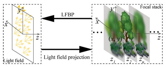In order to obtain a more realistic light ray field reconstruction with higher quality, iterative light ray field reconstruction based on back-projection (iLFBP) techniques has been reported [71,72]. These kinds of techniques are based on the fact of the interchangeable property between 2D camera images and the light ray field, which is indicated by Equations (1) and (5). Based on this imaging geometry, both Yin et al. and Liu et al. have reported an iterative light ray field reconstruction technique from focal stack measurements [71,72]. Their methods share the same concept.