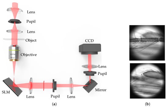 System setup (a) and two of the captured out of focus images (b) of the fast light ray field acquisition with point spread function (PSF) modulation (Adapted with permission from [64], Optical Society of America). SLM: spatial light modulator; CCD; Charge-coupled device.