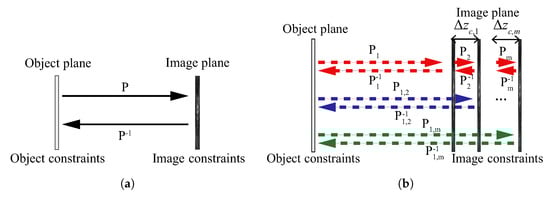 Fresnel transformed images can also be used instead of Fourier transformed images [88], i.e., P and can be either Fourier transform or Fresnel transform. The Fresnel transformation between the object and measurement planes instead of Fourier transform was a milestone. This makes the iterations not only be confined between object and image plane, but among multiple diffracted intensity images. The iteration among the object and the measurements can have many combinations, as Figure 13b shows. Bounces can be performed for all of the planes in one loop through the path of , or only be performed between object plane and each image plane sequentially through the path of . It can even be performed only among the measurements. As a result, the prior knowledge about the object became unnecessary. Multiple measurements have improved the accuracy of the phase retrieval and the unnecessary object prior requirement, and result in a broader application of iterative phase retrieval [89,90,91].