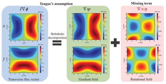 where k is the wave number , and is the position vector representing the transverse spatial coordinates . ∇ is the gradient operator over , which is normal to the beam propagation direction z. is the intensity, located without loss of generality at the plane , and is the phase to be retrieved. Expanding the right-hand side (RHS) of Equation (9), one obtains