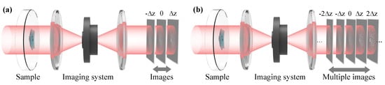 However, introducing a reference beam requires a complicated interference experimental setup, which limits its applications and also induces some other problems in hologram reconstruction, such as the direct current (DC) term, twin-image, and speckle noise. Solving these problems usually requires a more complicated experiment setup [46,48,49]. Therefore, interferometric techniques are not well suited to imaging, such as an optical microscope that requires partially coherent light. It is necessary to remove the complexity and the coherent limitations of the interferometric techniques. Alternatively, this can be achieved by using out-of-focus images. We can use one intensity image measured with a known complex transfer function or a set of out-of-focus intensity images to estimate the phase quantitatively. This is known as phase retrieval. It takes the advantage of the development of computational imaging [16], leading to a versatile and simple experimental imaging system. Even optical components like lenses are non-essential in a phase imaging setup with depth measurements, as Figure 5b shows, which leads to a broader applications of phase imaging, such as X-ray imaging [50].