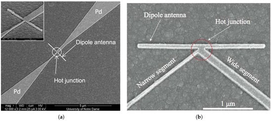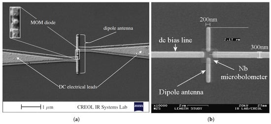 Scanning electron micrograph of a dipole antenna-coupled infrared detector example: (a) Antenna-coupled MOM diode [], (b) Antenna-coupled bolometer [].