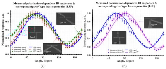 Polarization dependent measured responses of the ACMOMDs together with the corresponding cos-type fits for different configurations of read-out interconnect designs: (a) Symmetrical configurations, (b) Asymmetrical configuration [].