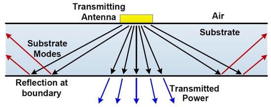 Surface waves, also known as substrate modes, are generated as excited trapped waves due to total reflection of waves that are incident beyond the critical angle [,]. Figure 8 gives a brief explanation for the generation of surface waves for a transmitting antenna lying on a substrate according to the ray point of view. As these waves propagate transversally and scatter at bends and surface discontinuities [], they result in performance degradation as well as cross talk between neighboring antennas. Usually, a lower radiation pattern due to the resultant power loss and a radiation pattern distortion due to multiple lobes and spikes are expected together with a lower polarization ratio [].