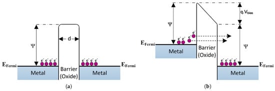 MOM diodes, also known as metal-insulator-metal (MIM) or metal-barrier-metal (MBM) diodes [], are implemented by simply sandwiching a thin oxide layer between two metals forming a potential barrier. For extremely high barrier and ultra-thin oxide barrier, conduction current arises due to the dominating quantum mechanical response and consequently non-linear I-V characteristics are observed. Figure 14a shows the potential barrier formed by the oxide layer as well as the biasing effect. Different configurations for the junction’s metals, either symmetric or asymmetric, have previously been studied. Some examples, found in the literature, of configurations that have been implemented include: Ni/NiO/W, Ni/NiO/Pt [], Ni/NiO/Ni [], Ni/NiO/Au, Cr/CrO/Au, Ni/NiO/Cu [], Cu/CuO/Cu [], , and . Although external bias is required to generate an electric field inside the barrier, in the case of asymmetric junction, a built in electric field will be generated due to the electrodes’ work function difference without any externally applied bias. In either case, as shown in Figure 14b, a trapezoidal shaped potential barrier between the electrodes will be formed promoting the electrons above the Fermi level in the raised electrode to have a higher probability of tunneling. As a result, there will be a net electron flow through the junction [].