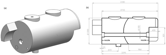 Geometry of the sprayer tank with a 3000 L of capacity. (a) Exterior 3-dimensional (D) view; (b) Internal longitudinal section, 2D view, with two interconnected parts. Dimensions in millimetres.
