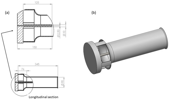 Geometry of the Venturi agitation nozzles. (a) Longitudinal section; (b) Three-dimensional (3D) view. Dimensions in millimetres.