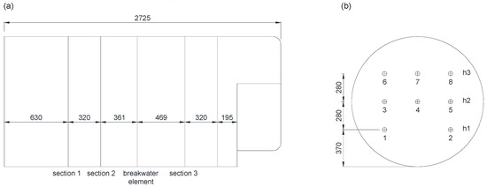 (a) Cross sections of where velocity measurements were made inside the tank (dimensions in millimeters); (b) Velocity measurement points within each of the four sections.