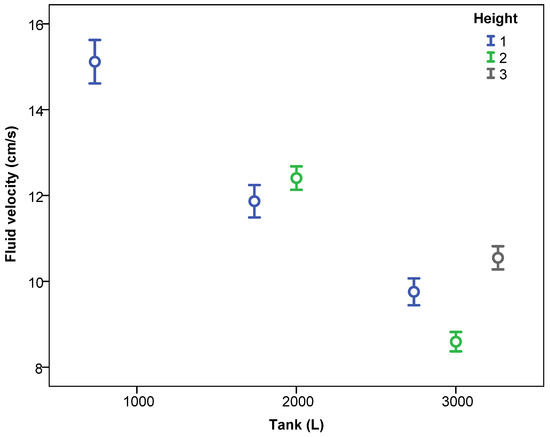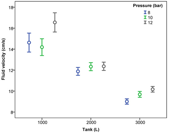 Considering the effect of the level of water inside the tank (1000, 2000 and 3000 L) and the pressure of the agitation circuit, Figure 5 shows the mean fluid velocity according to the level of water and the pressure. The fluid velocity decreased significantly as the water level in the tank increased. Considering mean values of all data, the fluid velocities for 1000, 2000 and 3000 L were 15.18, 12.19, and 9.61 cm/s, respectively. This fact shows that the lowest velocity values were produced when the tank was full. Results are in accordance with those obtained by [23] who used an ADV velocimeter in an aquaculture circular tank and, considering similar inlet flow rates, obtained higher velocities with the lower levels of water in the tank.