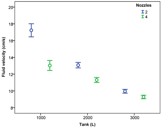 The number of active nozzles in the agitation system also significantly affected the fluid velocity (Figure 6); with 4 nozzles activated the velocities were lower than those with 2 nozzles (11.95 vs. 10.45 cm/s). This fact reflects that the location of the nozzles within the tank can affect the fluid velocity more significantly than does the number of nozzles activated. In this case, the nozzles were located on opposite sides of the tank so the effect of increasing the number of nozzles did not result in an increase in velocity. However, [10], who worked with 8 nozzles in the agitation system, registered a 14.8% velocity increase compared with that for 4 nozzles, although in this case all of the nozzles were aligned in the lower part of the tank, placed on the same work plane. This fact reinforces the importance of properly locating nozzles inside the tank, and the usefulness of velocity measurement systems, such that tested here, to validate this location.
