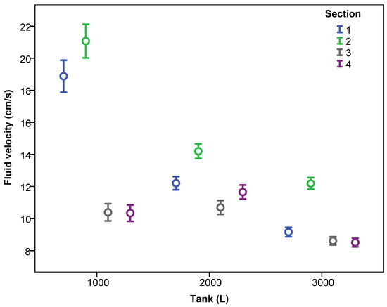 The position of the measuring point inside the tank had a significant influence on the fluid velocity. Table 5 shows the results of the Kruskal-Wallis test in relation to the effect of measuring point position (section, height, and measurement point) on the fluid velocity. All variables had a significant effect on fluid velocity.