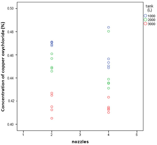 The average copper oxychloride concentrations were 0.446% for 2 nozzles and 0.439% for 4 nozzles. Although these differences were not significant, there was a tendency to obtain lower concentrations of active matter with 4 nozzles for each of the three tank fill levels (1000, 2000, and 3000 L), as shown in Figure 10.