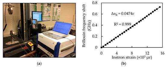 Telecommunication-grade single-mode optical fibers were used as distributed sensors [24,25,26]. Each fiber consisted of a core (diameter: 8.2 µm), a cladding (diameter: 125 µm), an inner coating (diameter: 190 µm), and an outer coating (diameter: 242 µm). The fiber core and cladding were made of high-purity silica; the inner and outer coatings were made of acrylic for mechanical protection. The strain sensitivity coefficient of the sensor was calibrated using the method in [19]. Three optical fibers with a gauge length of 250 mm were tested in tension at a displacement rate of 0.16 mm/min using a low-capacity load frame (model: Instron 5965, load capacity: 100 N) and a Neubrescope at room temperature (22 °C), as depicted in Figure 1a. Each optical fiber was passed through two protective sleeves that had a steel rod measuring 1.5 mm in diameter for mechanical protection. The protective sleeves were then bonded to the ends of the optical fibers and gripped by the load frame fixture for testing. The applied load and the fiber elongation were recorded by Instron at a sampling frequency of 10 Hz. Given the initial length of optical fiber, the strain values can be calculated from the elongation. At each load, the strain in the optical fiber was simultaneously measured using the load frame and the Neubrescope. The Neubrescope was used to measure the Brillouin frequency shift that can be converted into the strain change from Equation (1) when tested in the ambient temperature. Figure 1b plots the Brillouin frequency shift against the tensile strain of the optical fiber. The coefficient of determination (R2) for the linear regression is 0.999, indicating a good correlation. The strain sensitivity coefficient is represented by the slope of the line with the value of 4.74 10−5 GHz/με.