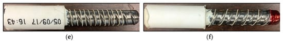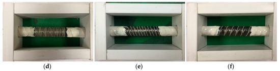 Figure 3 shows the steel bars with optical fibers. The specimen without any fiber on the bar is taken as the control specimen, designated as Ref (Figure 3a); the specimen with four fibers equally spaced along the bar is designated as L4 (Figure 3b); the specimens with spirally winded fibers are designated as S0, S2, S5, and S10, corresponding to the spacing of 0 mm, 2 mm, 5 mm, and 10 mm, respectively, as shown in Figure 3c,f. The PVC tube that covers a half of the embedded bar length is the bond breaker. Styrofoam strips were installed on the bars to ensure the bar was centered in the PVC tube. The bond breaker was fixed on the bar using a two-part epoxy at the ends of the concrete cylinder.