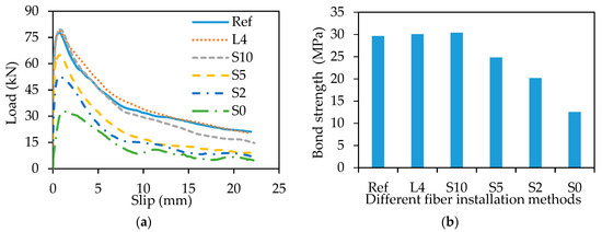 No significant difference was observed from the load-slip curves and the bond strengths of the specimens Ref, L4, and S10, indicating that the fiber installation of L4 and S10 do not significantly affect the bond strength. However, as the spacing is reduced from 10 mm to 5 mm, the bond strength is reduced by 18% (Figure 6b).