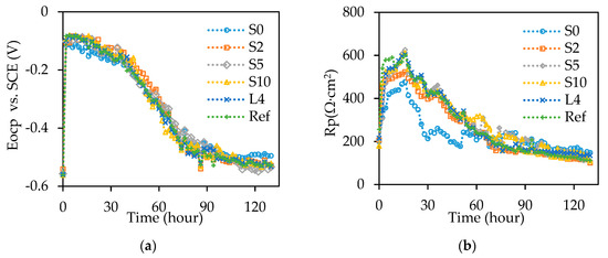 Before the accelerated corrosion test, the RP values of all the specimens are lower than 250 Ω·cm2. After the accelerated corrosion test for 2 h, RP of the specimens S0, S2, S5, S10, L4, and Ref rapidly increases to 309 Ω·cm2, 450 Ω·cm2, 305 Ω·cm2, 475 Ω·cm2, 344 Ω·cm2, and 540 Ω·cm2, respectively; at 16 h, RP of the specimens S0, S2, S5, S10, L4, and Ref gradually increases to 476 Ω·cm2, 522 Ω·cm2, 625 Ω·cm2, 611 Ω·cm2, 603 Ω·cm2, and 600 Ω·cm2, respectively. After that, the RP values decrease quickly to 210 Ω·cm2, 170 Ω·cm2, 263 Ω·cm2, 231 Ω·cm2, 184 Ω·cm2, and 190 Ω·cm2 for the specimens S0, S2, S5, S10, L4, and Ref, respectively, until 68 h, followed by a linear reduction until completion. Compared with the other specimens, S0 has relatively lower RP values from 0 to 60 h and higher values after 60 h. The different OCP and RP values indicate that the corrosion process is associated with the sensor installation method.