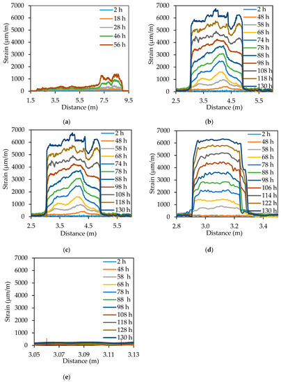 Figure 8a shows the strain results from S0. There is no obvious strain change within the first 18 h. Then, the strain increases with time until 56 h. The strain change within the length 7.2 m to 9.0 m is larger than the strain change in the other parts of the fiber, indicating that corrosion of the bar length that corresponds to the fiber length from 7.2 m to 9.0 m is more severe. After 56 h, the distributed sensor failed to measure, because of significant signal loss caused by the corrosion induced macrobend of the optical fiber. The macrobend loss is dependent on the bend radius and number of circles. Thus, S0 is more susceptible to macrobend loss compared with the other specimens. Figure 8b shows the strain distributions from S2. The fiber length from 3.0 m to 5.0 m is subjected to strain changes that increase over time until 118 h. The distributed sensor continued to be functional and provided reasonable measurement after 130 h. Once again, non-uniform strain distributions are observed at each time instant. Similarly, Figure 8c,d show the strain distributions from S5 and S10, respectively. The distributed sensors in S5 and S10 continued to be functional after 130 h. Figure 8e shows the strain results from L4. The fiber length from 3.06 m to 3.12 m was in contact with the steel bar. There was negligible strain change over 130 h, revealing that the distributed sensor in L4 failed to detect corrosion of the bar.