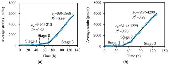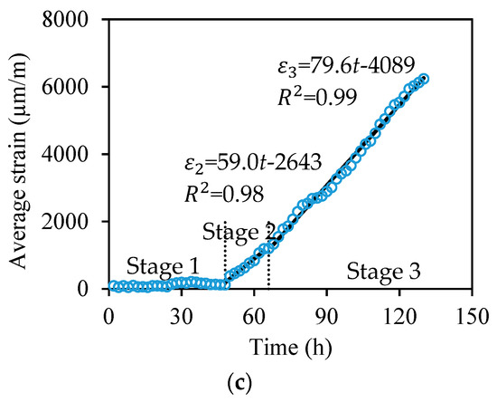 To investigate the strain increasing rate in different specimens, the expansion strain measured from the distributed sensor is averaged over the fiber length in contact with the steel bar at each time instant. Figure 9a–c plot the averaged strains of S2, S5, and S10, respectively. Each curve can be divided into three stages. In Stage 1, the corrosion products diffuse and gradually filled the surrounding concrete pores [7,34]. This is corroborated by the very small strain change (less than 150 με) measured from the distributed sensors. Stage 1 is terminated when the majority of concrete pores at the steel–concrete interface is filled up and the corrosion products starts to increase the tensile strains. In Stage 2, the corrosion products continue to expand and tend to increase the tensile stresses in the concrete matrix. Stage 2 ends when concrete cracks. In Stage 3, ingress of water and oxygen is accelerated due to the concrete cracking [6,20]. Thus, the average strain increases approximately linearly with time at an increasing rate larger than that of the Stage 2. A linear regression analysis is conducted for Stage 2 and Stage 3, respectively. For the specimens S2, S5, and S10, the strain increasing rate of Stage 2 is 9.9 με/h, 31.4 με/h, and 59.0 με/h, respectively; the strain increasing rate of Stage 3 is 88 με/h, 79.9 με/h, and 79.6 με/h, respectively.