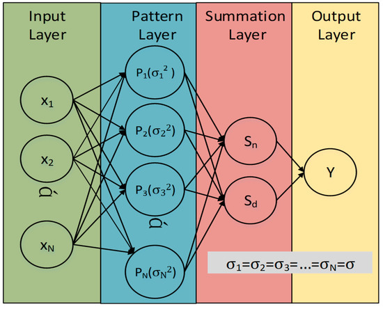 The general regression neural network (GRNN) developed by Specht in [32] is a kind of one-pass learning algorithm built on the notion of the kernel regression. Firstly, consider a nonlinear regression model defined by Equation (1).