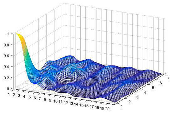 where k stands for the number of neighbors. Once the distance–weights set, W = [w1, w2, …, wn] ∈ 1×n, has been determined, the distributional diagram of all of the patterns’ distance–weights is available. There are 140 pattern neurons on the basis of fingerprints that are located in the x–y plane. The distribution surface is generated by the set W with the triangulation-based natural neighbor interpolation method, as shown in Figure 4. The data was from our training sample data set. The distance–weights are calculated by Equation (12), and are then regularized by the max–min method for convenience. It is very intuitional that the distance–weights of the training data are distributed on a rough surface with a steep crest in the bottom left corner of it. The peak indicates where the maximum distance–weight pattern neuron is.