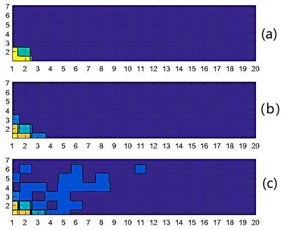 Pattern neurons partitioned with different steps (labels on the x axis and y axis are indices of RPs). (a) Existing thre categories when Δ = 0.4; (b) existing five categories when Δ = 0.2; (c) existing six categories when Δ = 0.1.