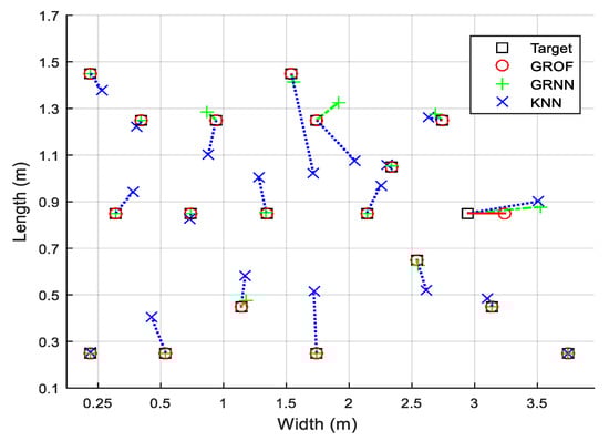 The results of the four methods are shown in Table 3. The mean localization error of the GROF is 0.087 m, which is smaller than the 0.103 m of the standard GRNN and the 0.121 m of the BPNN. The performance of the KNN is the worst. The results show that the RMSE performance of the proposed method is up to 15% lower than the traditional GRNN method, up to 29% lower than the BPNN method, and up to 43% lower than the KNN method.