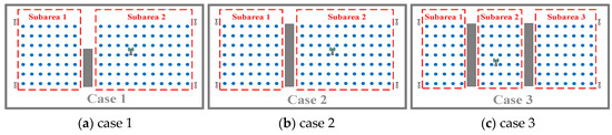 In the first case, the object area was firstly divided into two subareas, as shown in Figure 10a. The spread values of the GROF were trained into five categories in the diagonal matrix, and the adjacent threshold is defined as 0.25 m in each subarea. The optimal spread values of the original GRNN were trained by the cross-validation method. In the KNN method, k = 4 based on the lowest RMSE of the validation data. The compared BPNN contains one hidden layer with 80 neurons and uses the hyperbolic tangent activation function.