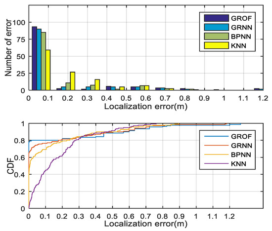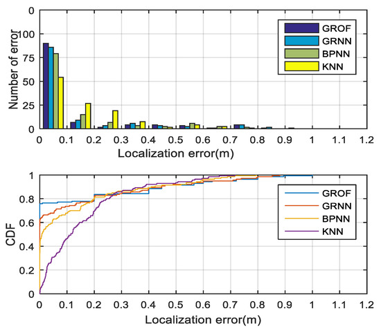 The histogram and cumulative distribution function (CDF) of the localization errors for each algorithm are drawn in Figure 16. From the experimental results, we conclude that the localization performance of the proposed GROF method is superior to the KNN algorithm, the standard GRNN algorithm, or the BPNN method. In general, the GROF outperforms the other algorithms in the LOS case.