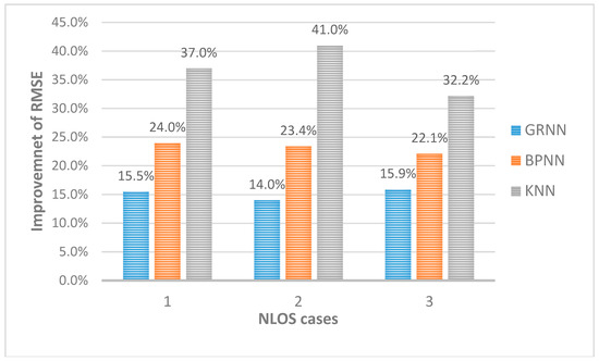 The RMSE improvement of GROF versus different algorithms in three NLOS cases.