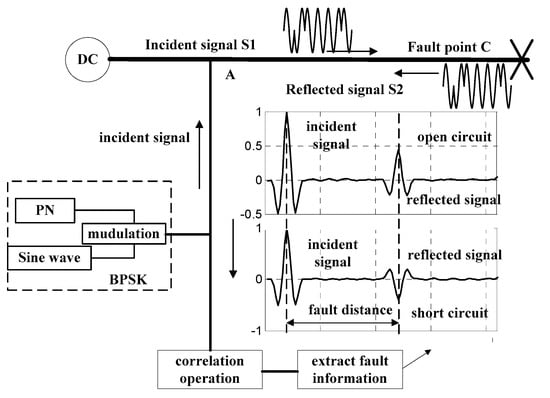 In the past decades, reflectometry techniques were developed and widely used for cable fault diagnosis [1] because of their advantages in real-time processing and easy design. According to the incident signals, reflectometry methods are divided into Time Domain Reflectometry (TDR) [3,4,5], Frequency Domain Reflectometry (FDR) [6], Sequence Time Domain Reflectometry (STDR) [7,8], Spread Spectrum Time Domain Reflectometry (SSTDR) [7,8], Joint Time-frequency Domain Reflectometry (JTFDR) [9], and Noise Domain Reflectometry (NDR) [10]. Among these methods, NDR, STDR, SSTDR, and JTFDR [11,12,13,14,15] are capable for online diagnosis. Notably, SSTDR has advantages over others in high performance of anti-interference, which means no influence on the normal working of the system.