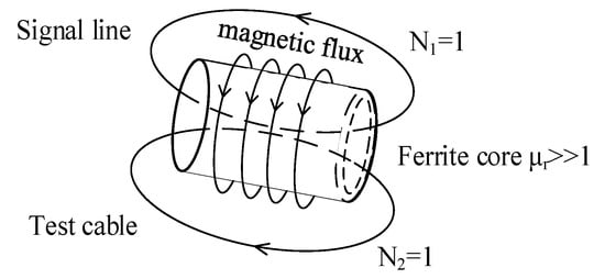 Figure 5 shows the working principle of the coupler. According to the theory of self and mutual inductance, an electromotive force (emf) is induced in the test cable by the signal line. When the signal line has current i1, magnetic flux φ11 is produced. Because of ferrite’s high relative permeability (μr >> 1), the magnetic field mainly exists in the ferrite core and almost all magnetic flux is coupled the test cable.
