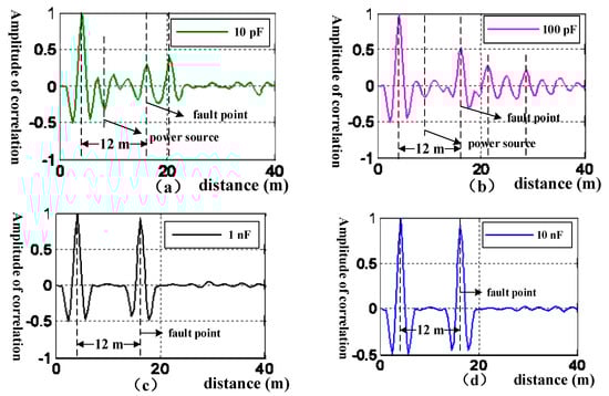 Diagram of cable fault diagnosis with different values of capacitance. (a) The trapper with capacitance of 10 pF. (b) The trapper with capacitance of 100 pF. (c) The trapper with capacitance of 1 nF. (d) The trapper with capacitance of 10 nF.