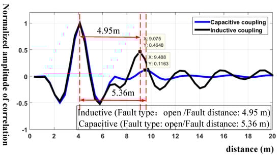 It shows clearly that the inductive coupling non-intrusive method detects an open circuit located at 4.95 m. The position error is 20 cm, which is in the theoretical error range. The value of the reflection coefficient is 0.465, which is close to theoretical analysis. On the contrary, the capacitive coupling non-intrusive method has a position error of 61 cm, which is larger than the theoretical error. The peak amplitude of the correlation is 0.12, which can easily lead to a false alarm or leak detection. The statistical result of the simulation is shown in the Table 1, which leads to the conclusion that inductive coupling has higher locating accuracy than capacitive coupling. More importantly, the signal attenuation in capacitive coupling is larger than that in inductive coupling, which is consistent with the mathematical analysis and verifies the advantages of the non-intrusive inductive coupling cable fault diagnosis.