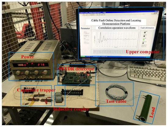 In this section, experiments of open and short fault modes are conducted to verify the proposed approach. Figure 9 shows the experimental platform, which includes the SSTDR detector, the inductive coupler, the capacitive trapper, the test cable, and the impedance matching networks. The non-intrusive cable fault diagnosis device is clearly shown in Figure 10.