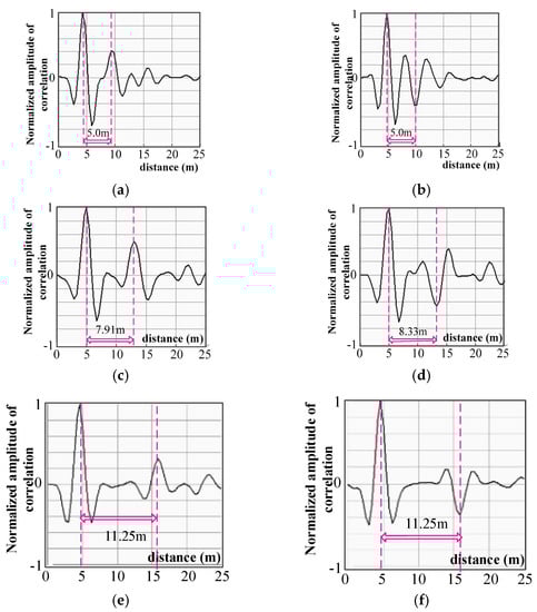 Experimental diagram of inductive directional non-intrusive coupled cable fault diagnosis. (a) open circuit of 4.75 m; detected location is 5 m and error is 0.25 m; 167% larger than 2nd largest peaks. (b) short circuit of 4.75 m; detected location is 5 m and error is 0.25 m; 66.6% larger than 2nd largest peaks. (c) open circuit of 8.10 m; detected location is 7.91 m and error is 0.19 m; 212% larger than 2nd largest peaks. (d) short circuit of 8.10 m; detected location is 8.33 m and error is 0.23 m. 156% larger than 2nd largest peaks. (e) open circuit of 11.0 m; detected location is 11.25 m and error is 0.25 m; 357% larger than 2nd largest peaks. (f) short circuit of 11.0 m; detected location is 11.25 m and error is 0.25 m. 500% larger than 2nd largest peaks.