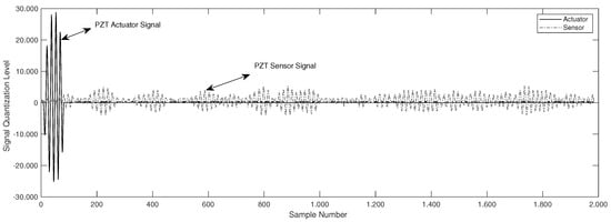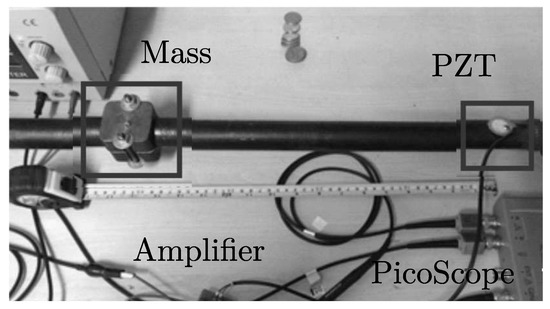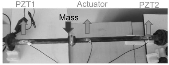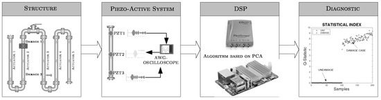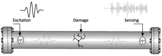 The equipment uses an active piezo-diagnosis scheme that consists of using piezoelectric devices to produce elastic waves and evaluate its propagation along the examined structure. Figure 2 presents the specific configuration used here used, where a PZT mounted on the structure surface operates as an actuator (electrical energy is converted to mechanical energy is converted to produce guided waves along the surface) by taking advantage of piezoelectric effect. The other PZT works as a sensors in a pitch-catch mode to measure elastic wave propagation, that contains information about scattering, reflection, and mode conversion. The applicability of PCA statistical modeling on guided waves response is demonstrated in author’s previous works [24,25], where it is evaluated the feasibility of a monitoring scheme based on torsional guided waves for detecting damages in pipes is evaluated. Thus, the acoustoelasticity effect is implemented taking advantage of a data-driven approach based on statistical processing for structural monitoring purposes.